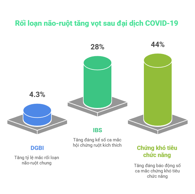- Tỷ lệ mắc Rối loạn Não-Ruột (DGBI) chung đã tăng từ 38,3% lên 42,6% sau đại dịch.