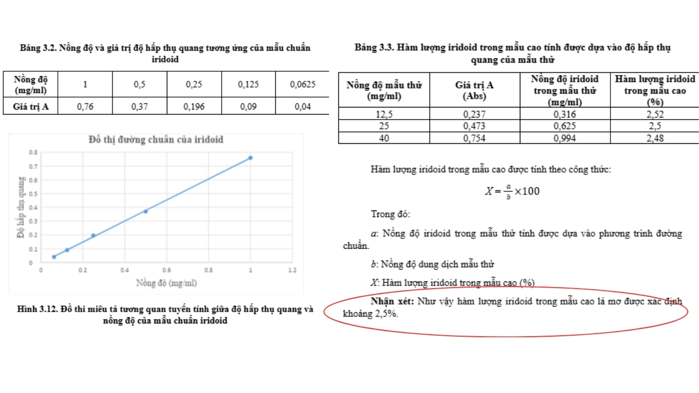 Bằng phương pháp đo quang và xây dựng đường chuẩn, nghiên cứu đã xác định hàm lượng iridoid toàn phần trong cao lá mơ là khoảng 2,5%.