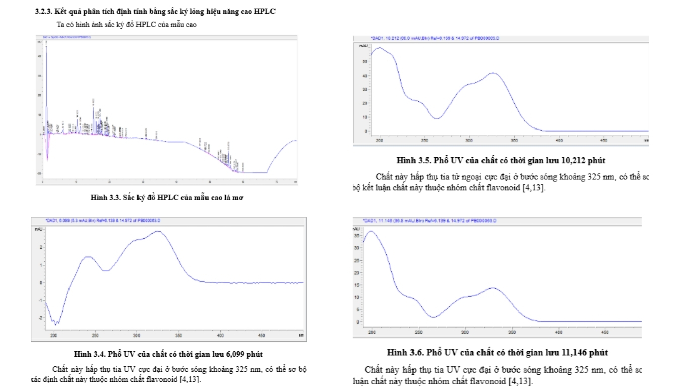 Kết quả HPLC không chỉ khẳng định sự có mặt của các nhóm chất đã biết như iridoid và anthraquinon mà còn đưa ra một phát hiện mới quan trọng: sự hiện diện của các chất thuộc nhóm flavonoid. Đây là điều mà các phương pháp định tính hóa học thông thường đã không phát hiện được, cho thấy tiềm năng nghiên cứu sâu hơn về nhóm chất này trong lá mơ.